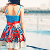 Description: Girl looking out in a Blue and Red Dress